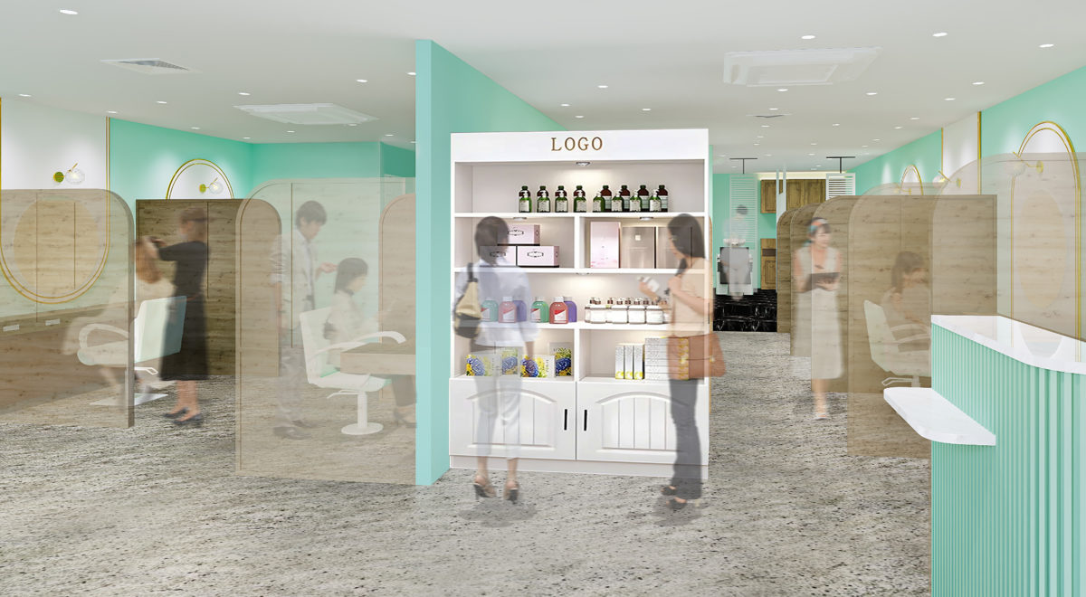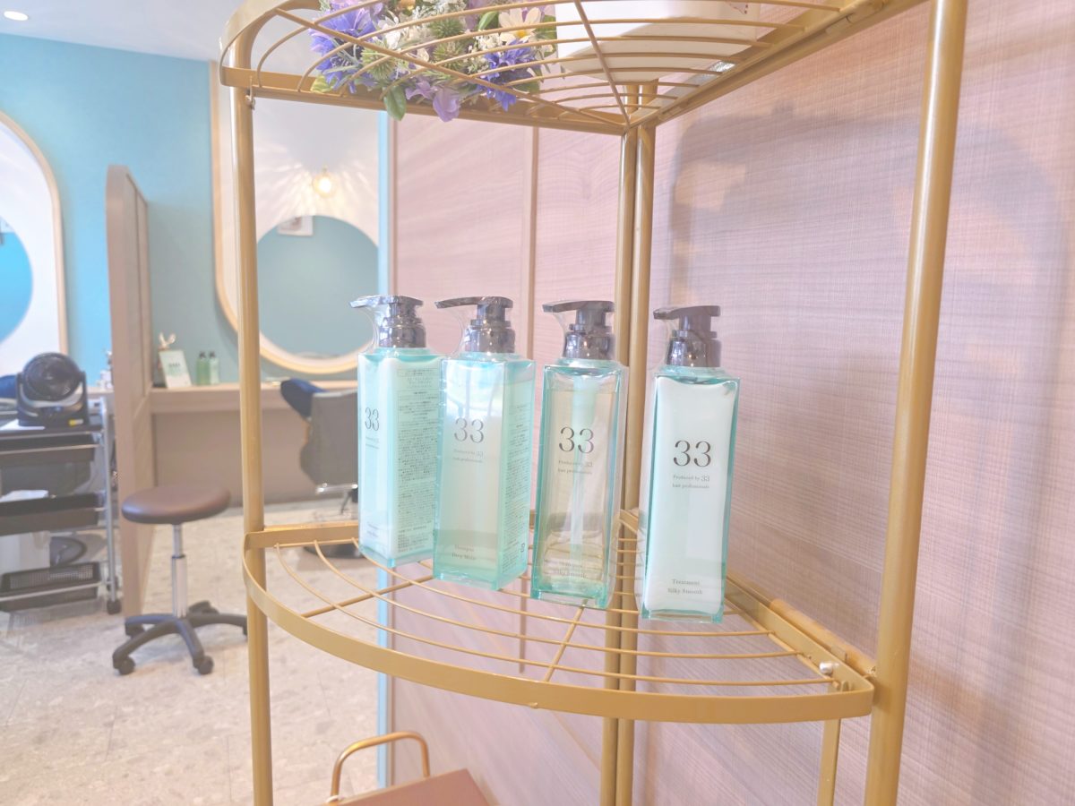 今まで待合いはテレビを設置してましたけど、今回の店舗からそれらを撤去してオシャレな店販棚を設置してみました。33もそうだけど、それ以外のスタイリング剤もズラりと飾ってお客様がそれらを自然と手に取ってもらえるようなサロン空間を心がけました。