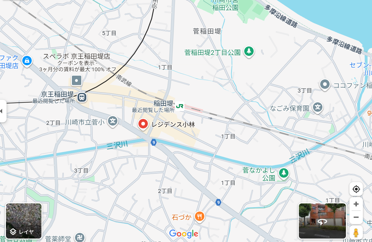 ↑物件の場所は地図で言うとこんな感じ。駅近でちょっとだけ南武線が近いのかなぁ。。右上の方には多摩川が見えます。