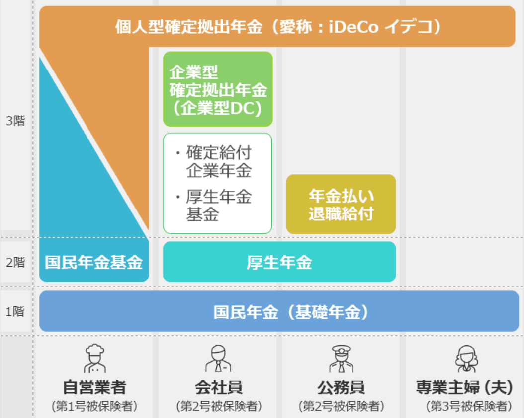 よく年金は一階とか二階とか階段式だって言われてるよねぇ。↑この図でもあるように、個人事業主もiDeCoとか国民年金基金とかしっかりやりこめば3階部分ぐらいまでは網羅出来るのかなとは思います。