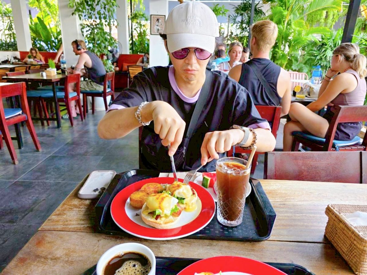 ホテルで朝ごはん。エッグベネディクトをチョイス。うまし。